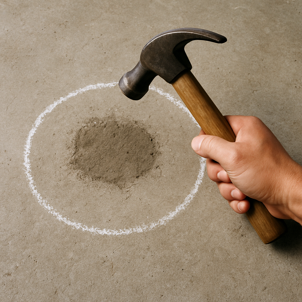 • Пустоты — простукивание молотком. Звонкий звук — бетон плотный. Глухой, «бубнящий» — под стяжкой воздух, пустота.